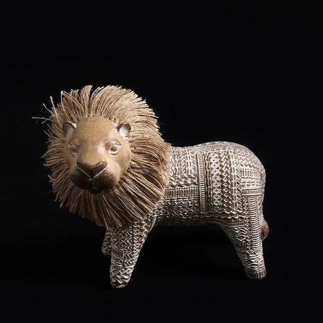 Bring a touch of Scandinavian folk charm to your shelves with this small lion sculpture. Hand-finished in textured beige resin, the piece mixes playful expression with artisanal detail – from the woven-look mane to the patterned body. Sized to sit perfectly on a console, nightstand, or bookshelf, it works as a cozy accent on its own or layered with candles, books, and vases. A warm little guardian for your bedroom or living room styling.